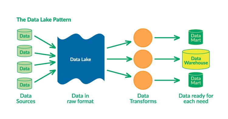 데이터 레이크는 데이터 레이크는 데이터웨어하우스를 기반으로 한 파이프라인보다 훨씬 더 큰 개념이다. 데이터 레이크는 구조화되지 않은 원시 데이터(Raw Data)를 그대로 저장하는 저장소로, 다양한 형태와 형식의 데이터를 대규모로 저장하고 분석하는 데 사용된다.