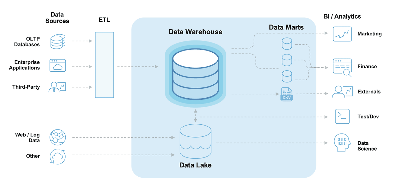 데이터 웨어하우스는 기업이 전략적 의사결정과 비즈니스 인텔리전스를 위해 데이터를 저장, 관리, 분석하는 데 사용되는 중앙 집중형 데이터 저장소이다.
