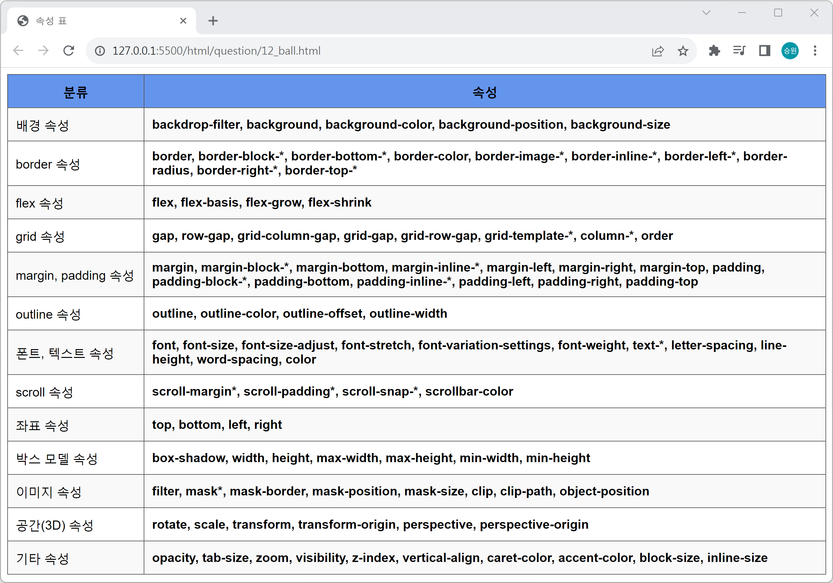 이외에도 적용 가능한 속성들이 굉장히 많다. 아래의 속성 표를 참고하도록 하자.