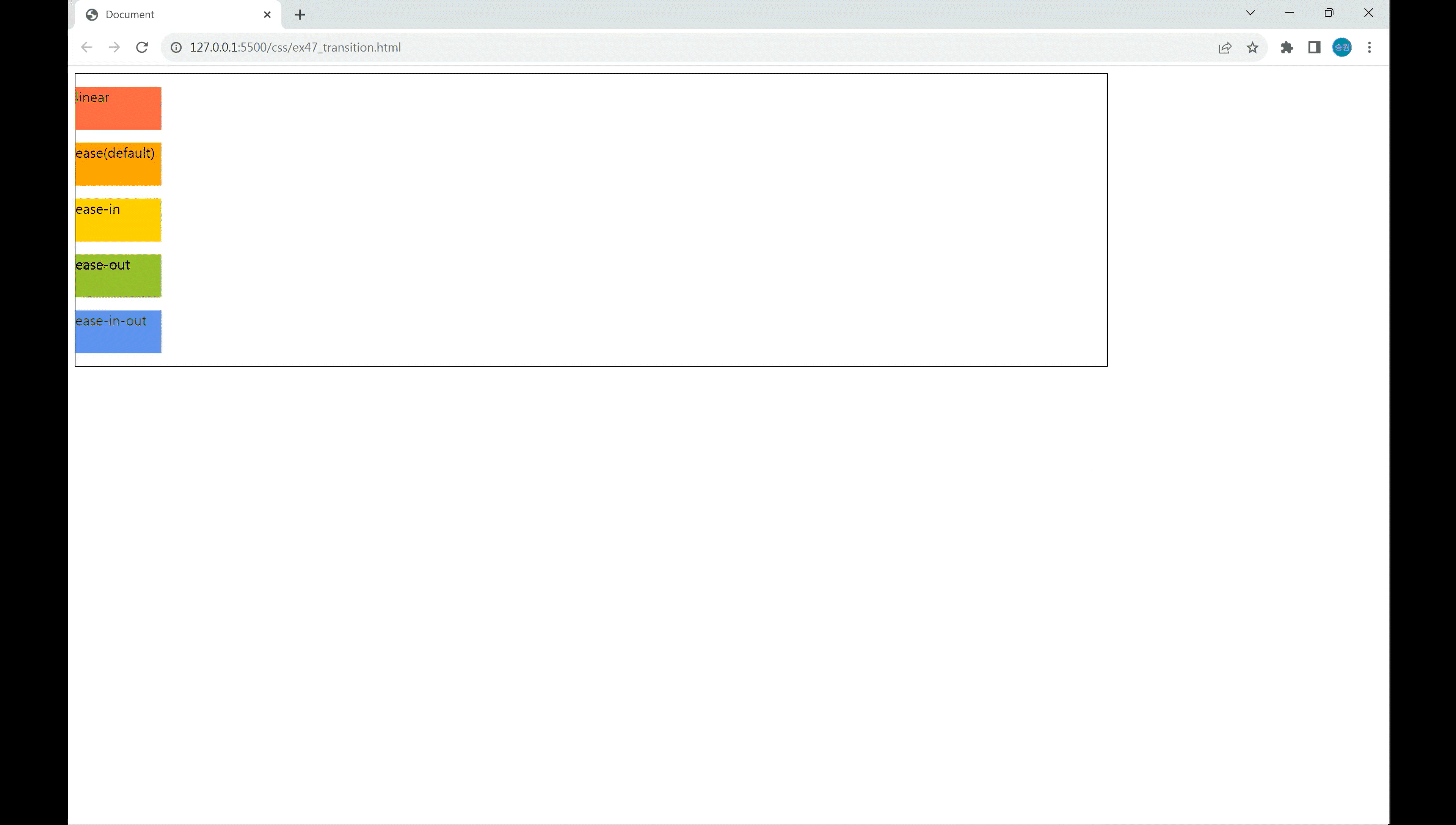 상자의 background-color가 gold에서 tomato로 변화하는 과정에 주황색이 되면서 자연스럽게 색이 변화하는 것을 볼 수 있다.