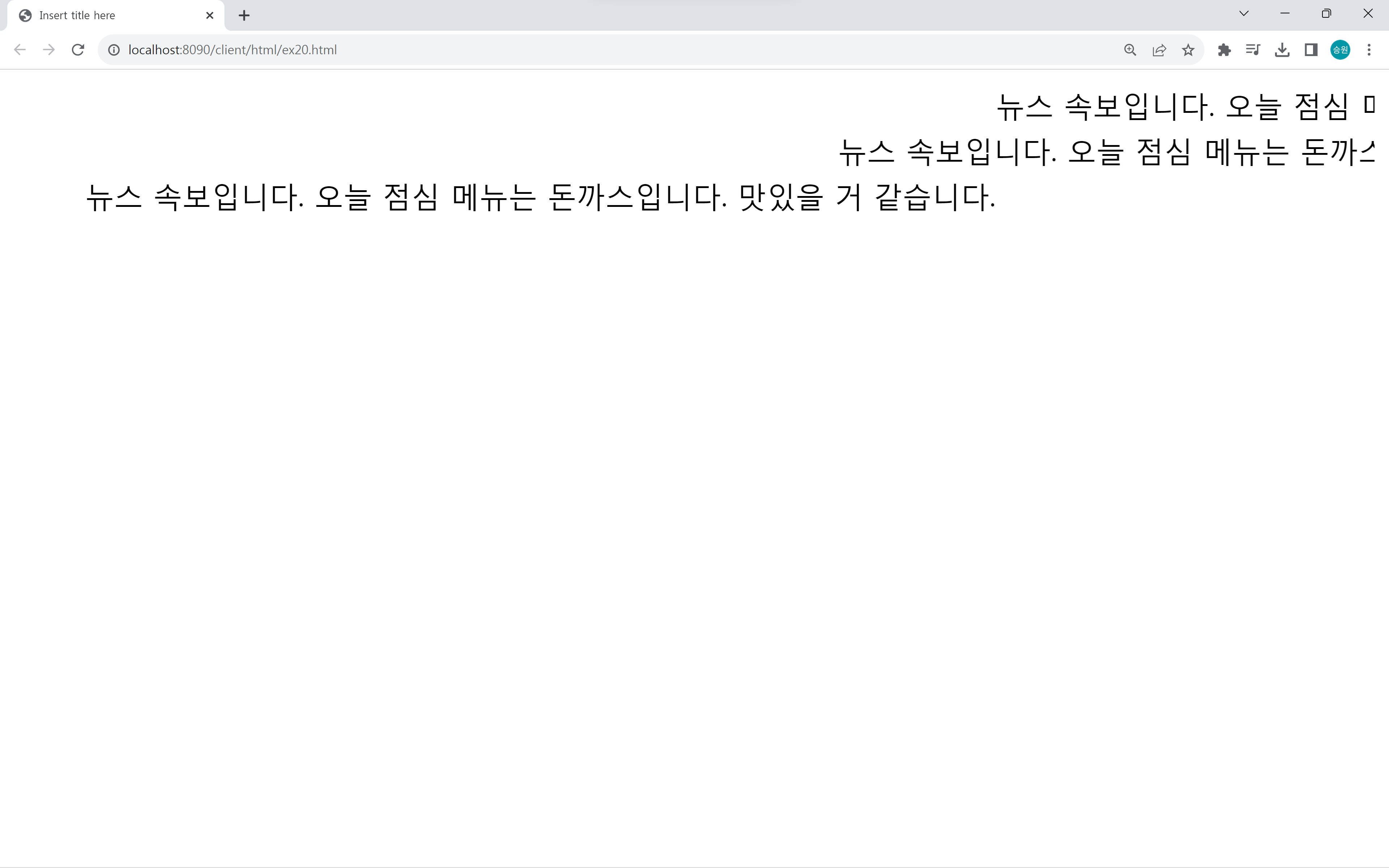 <marquee>뉴스 속보입니다. 오늘 점심 메뉴는 돈까스입니다. 맛있을 거 같습니다.</marquee>