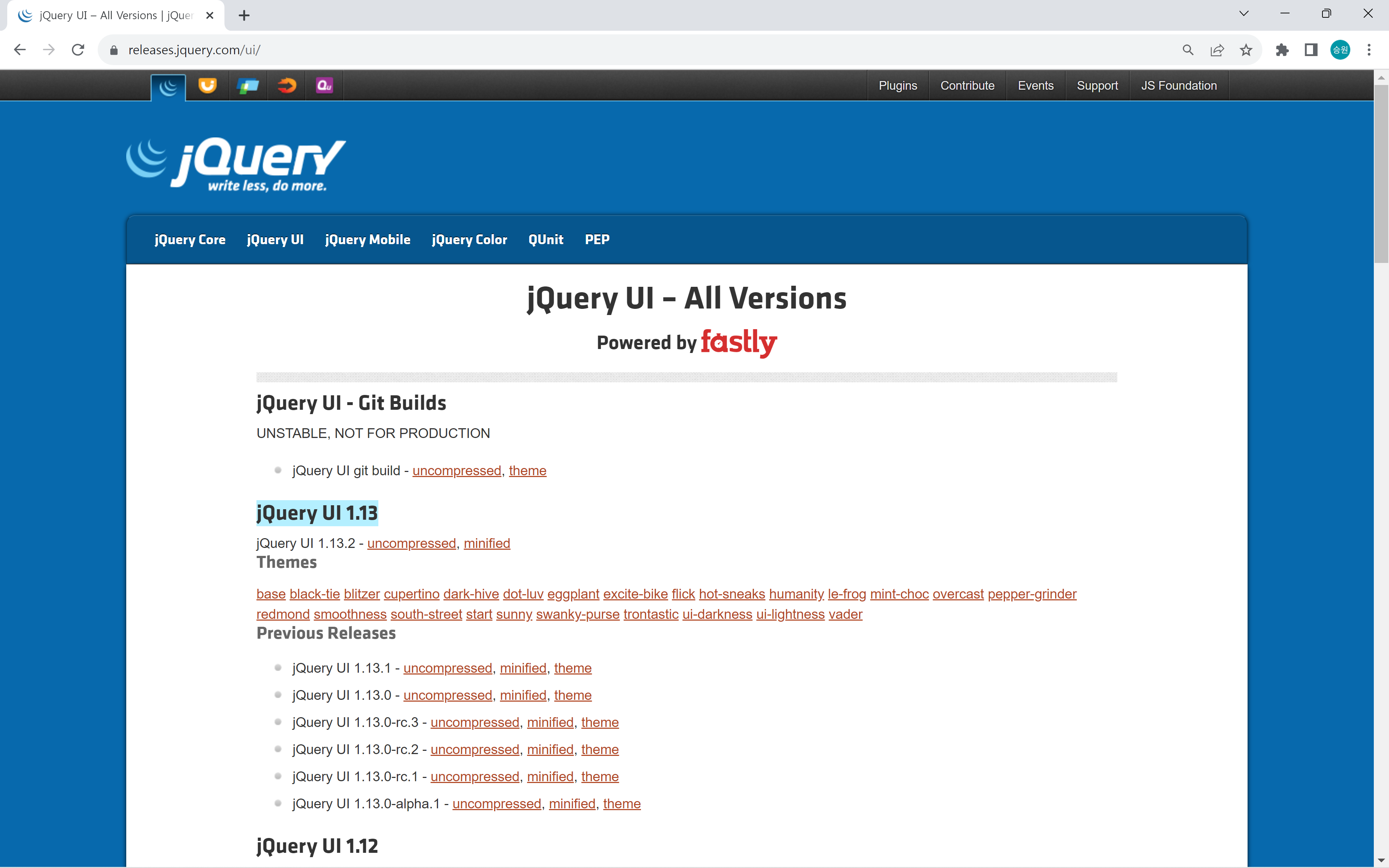 jQuery UI – All Versions jQuery UI - Git Builds UNSTABLE, NOT FOR PRODUCTION jQuery UI 1.13 jQuery UI 1.13.2 - uncompressed, minified Themes base black-tie blitzer cupertino dark-hive dot-luv eggplant excite-bike flick hot-sneaks humanity le-frog mint-ch