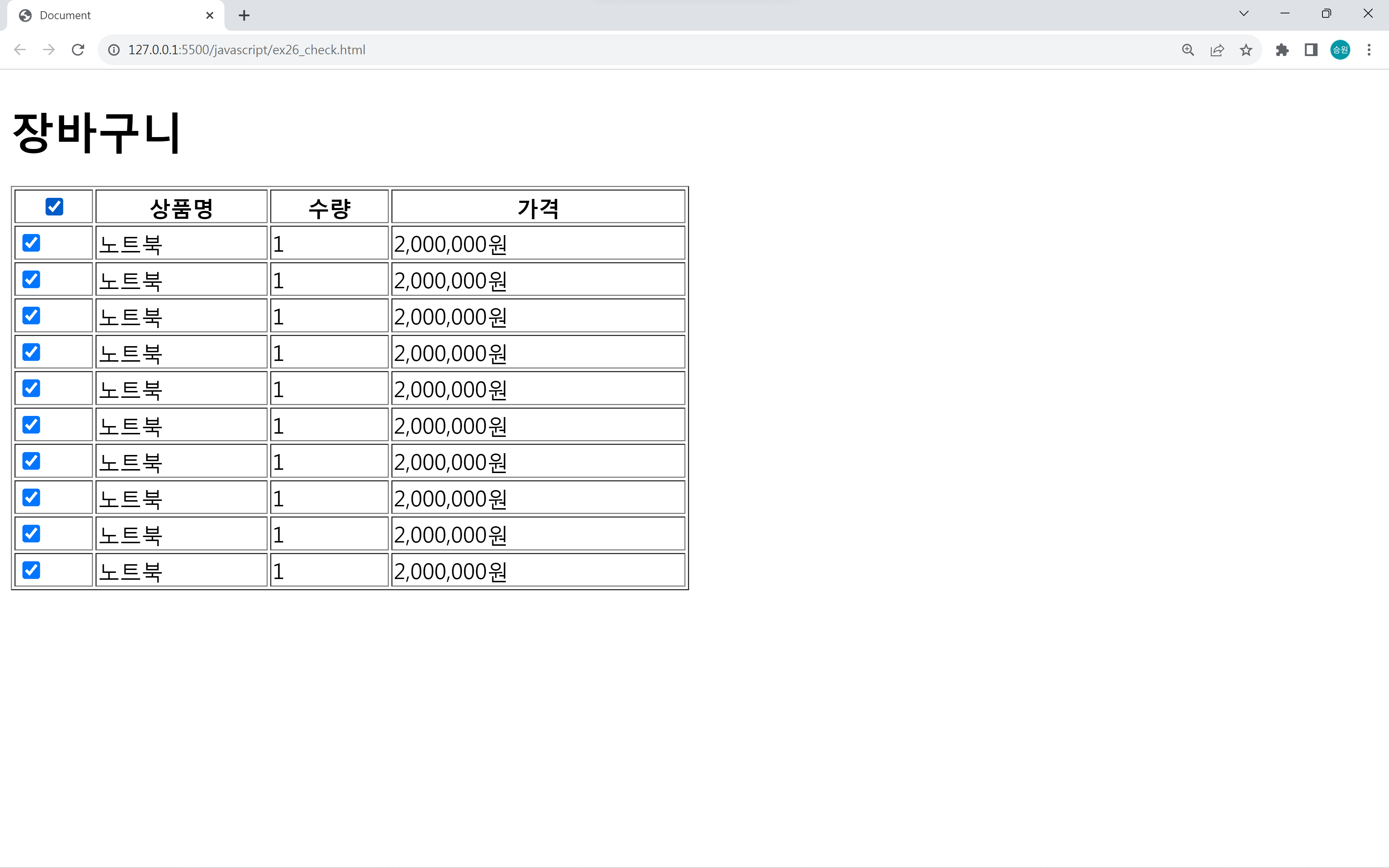 제일 위의 체크박스를 클릭하면 전체 선택이 되고, 상품별로 체크를 할 수 있게 한다.