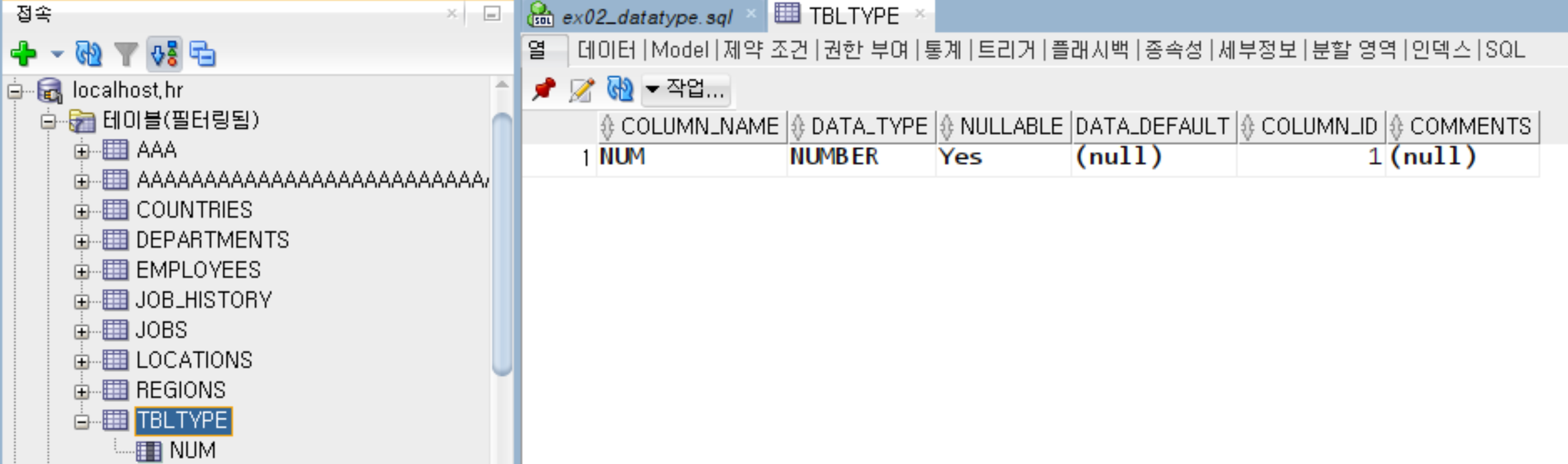 오라클은 모든 식별자를 대문자로 저장하기 때문에 TBLTYPE 테이블이 만들어진 것과, NUM 컬럼에 100 데이터가 들어간 것을 확인할 수 있다.