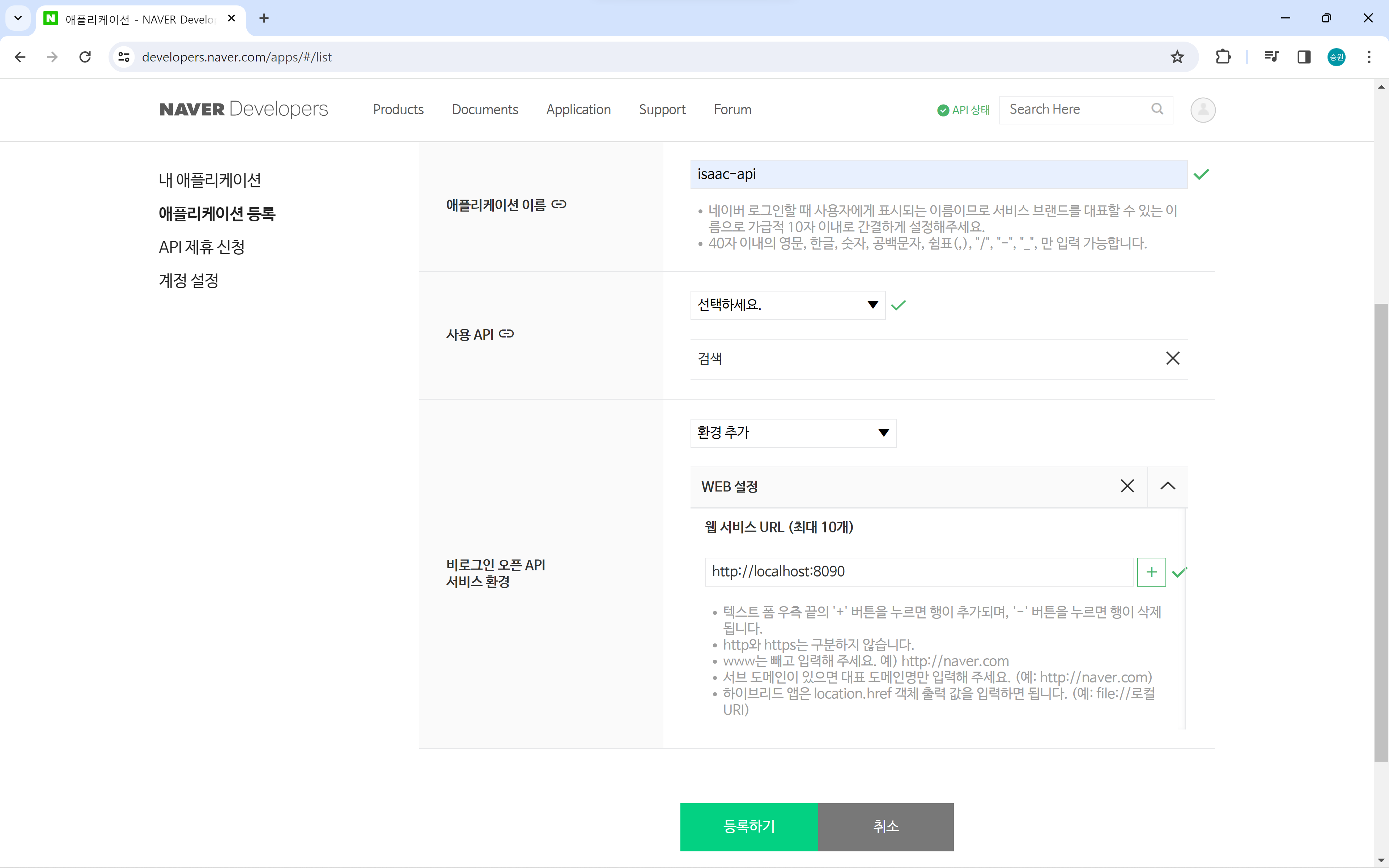 비로그인 오픈 API를 사용할 예정이므로 로컬 URL인 localhost를 입력하였다.