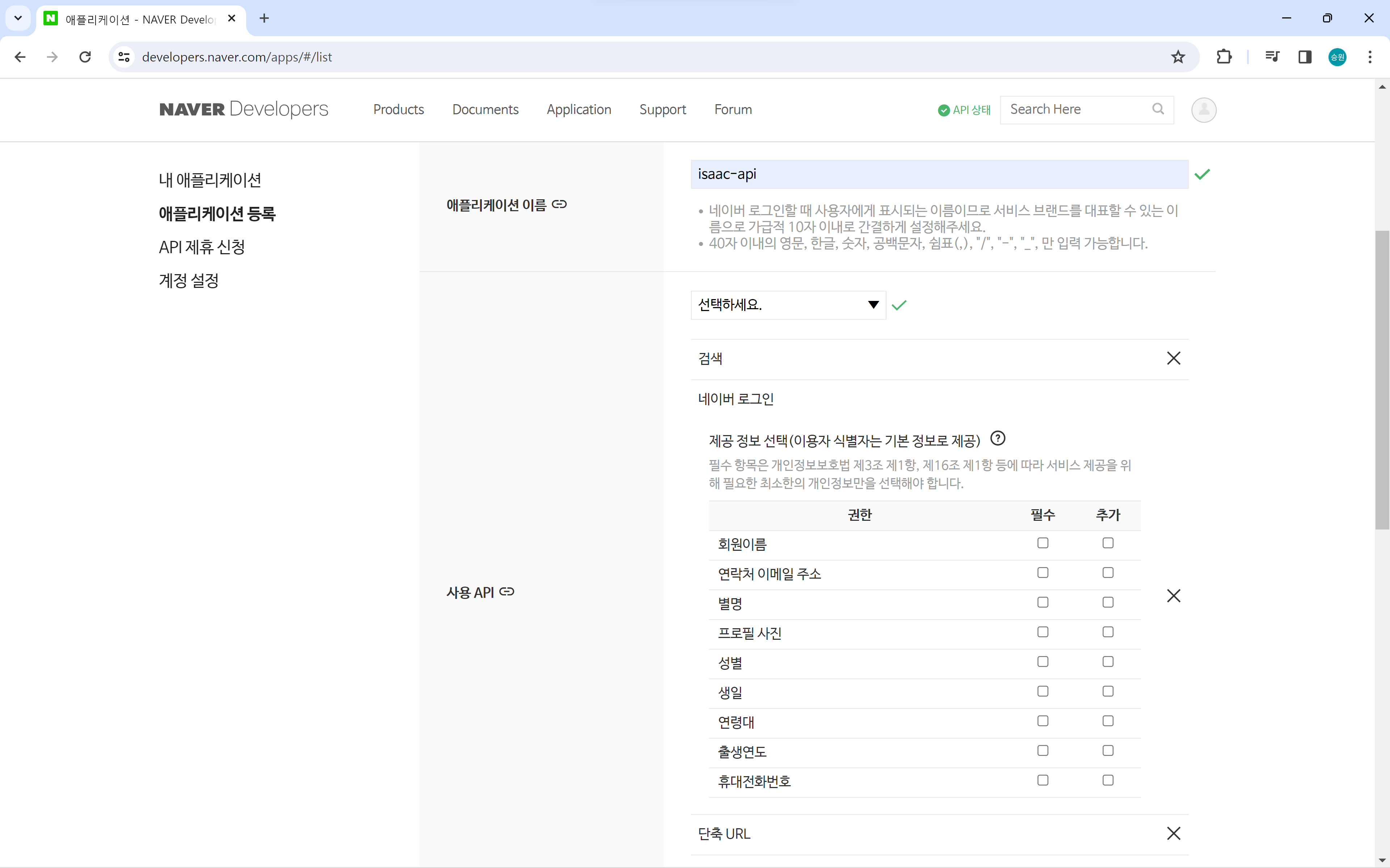 애플리케이션 이름을 작성하고, 사용할 API를 선택한다.