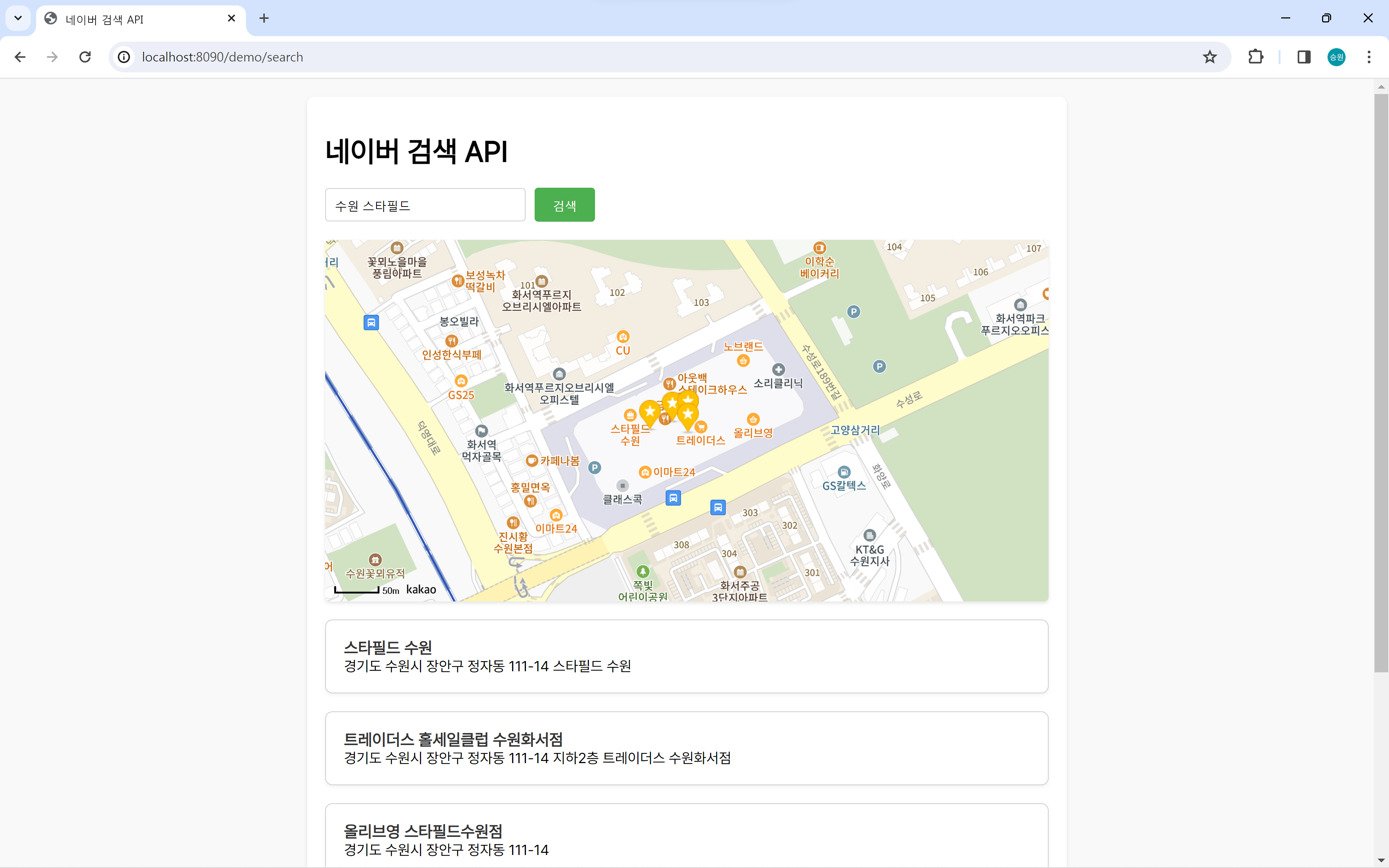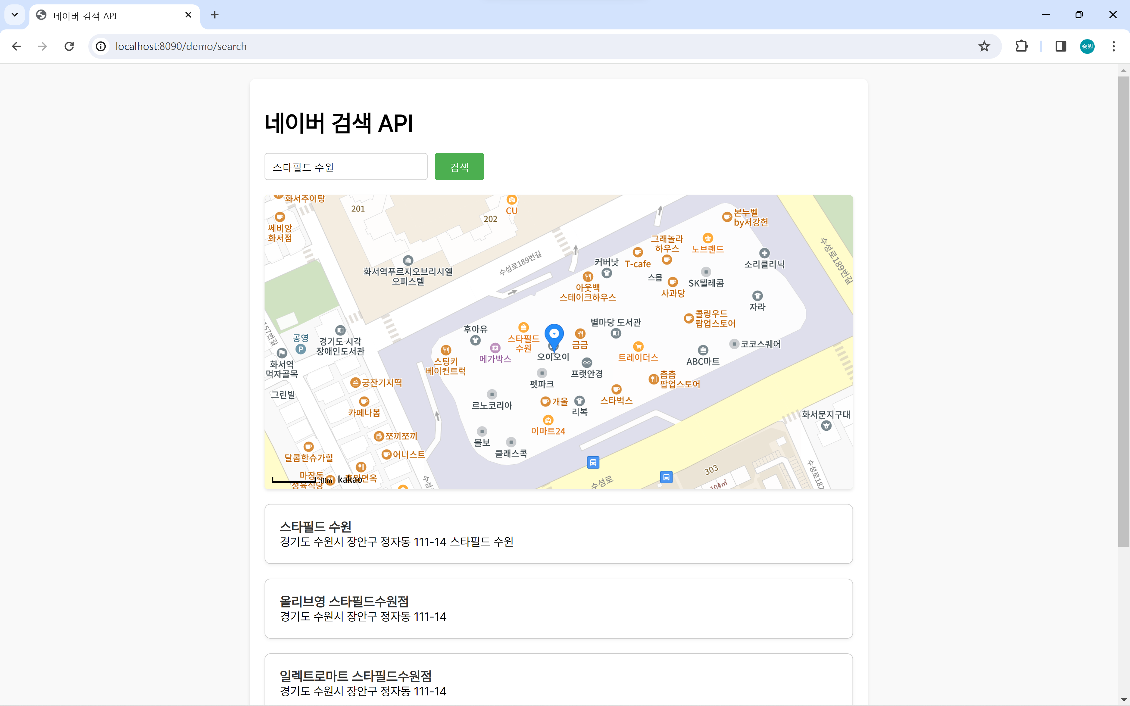 검색어로 '수원 스타필드'를 입력했을 때의 화면이다.