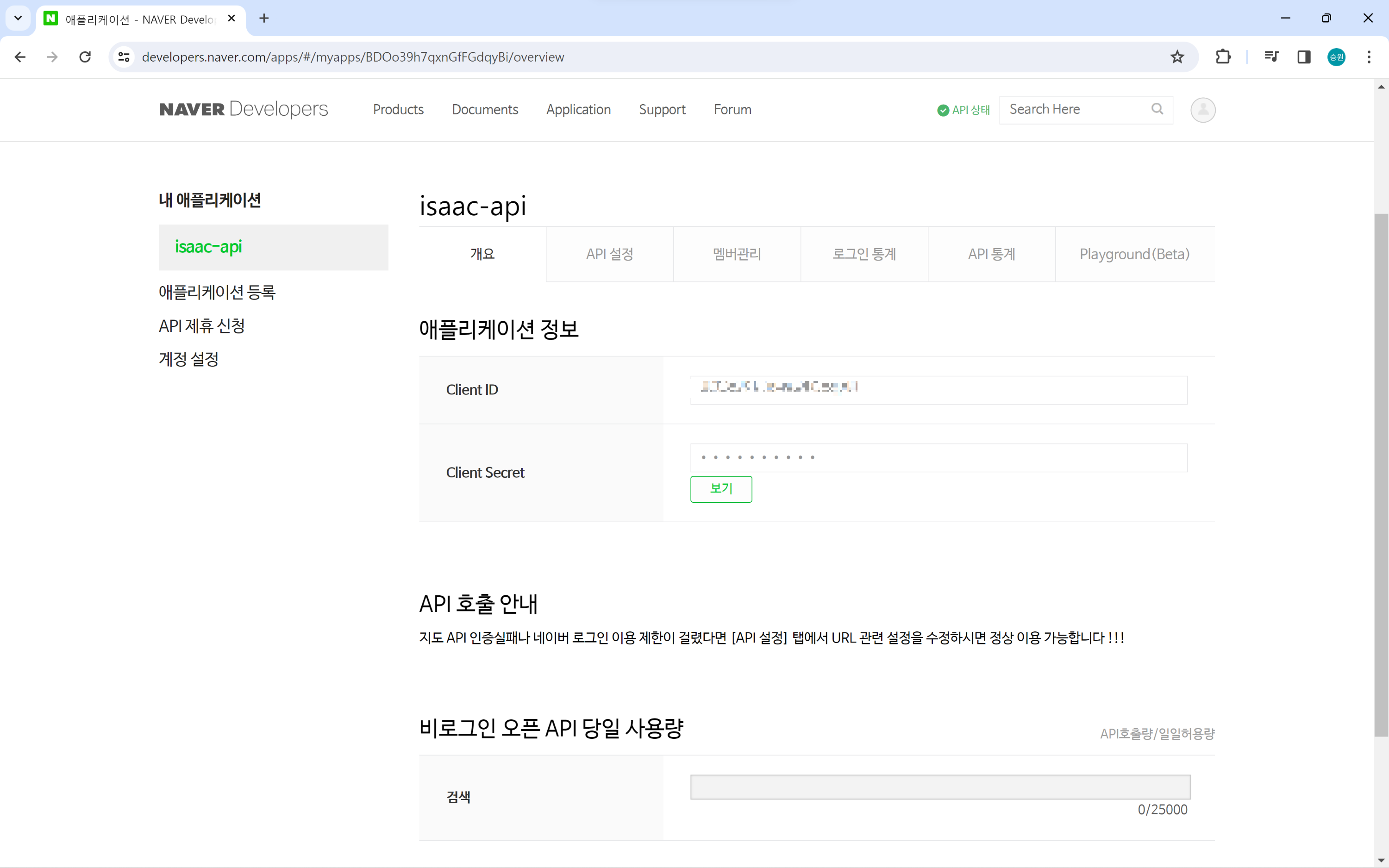 API 등록을 마치면 Client ID와 Client Secret을 부여받는다.