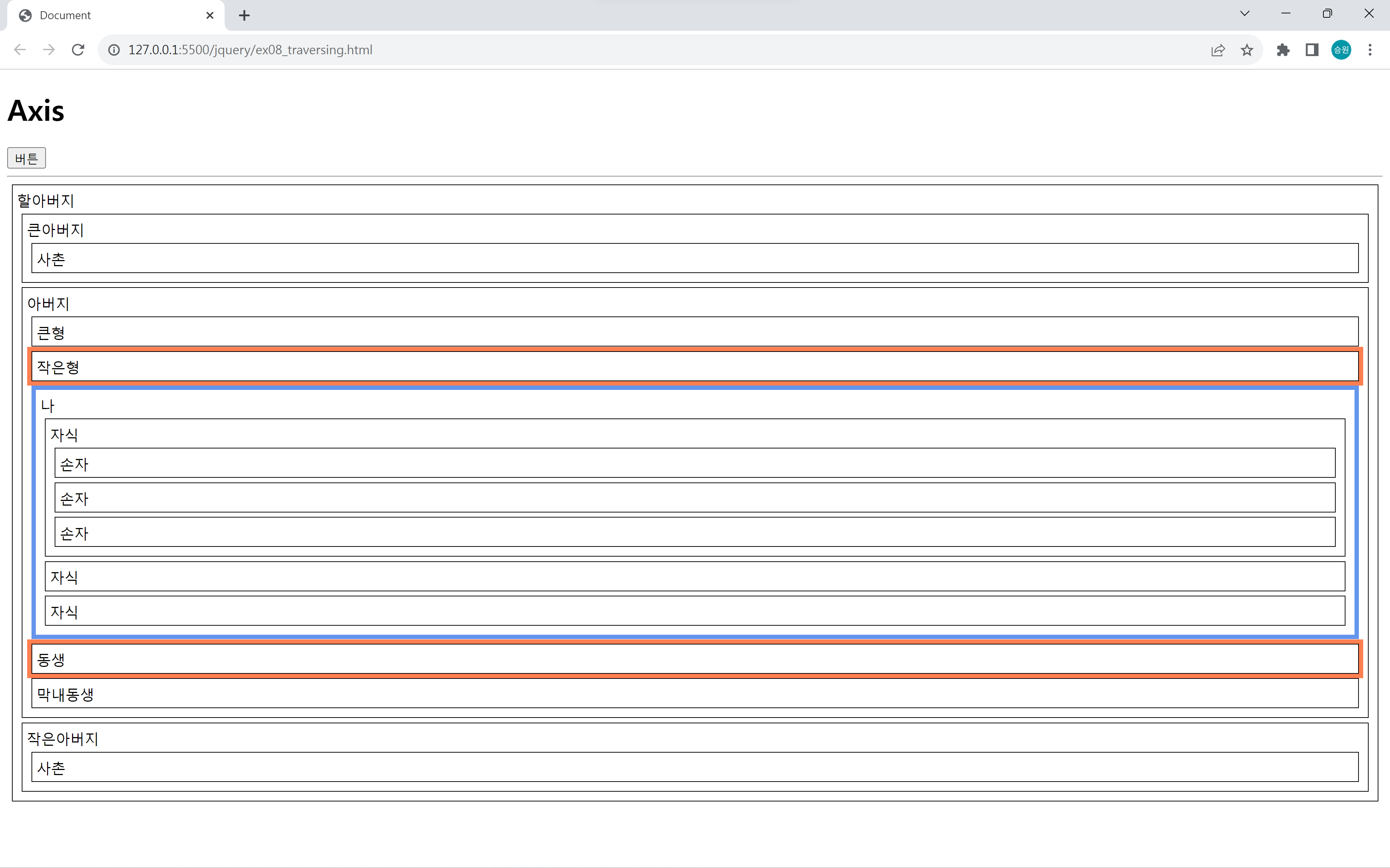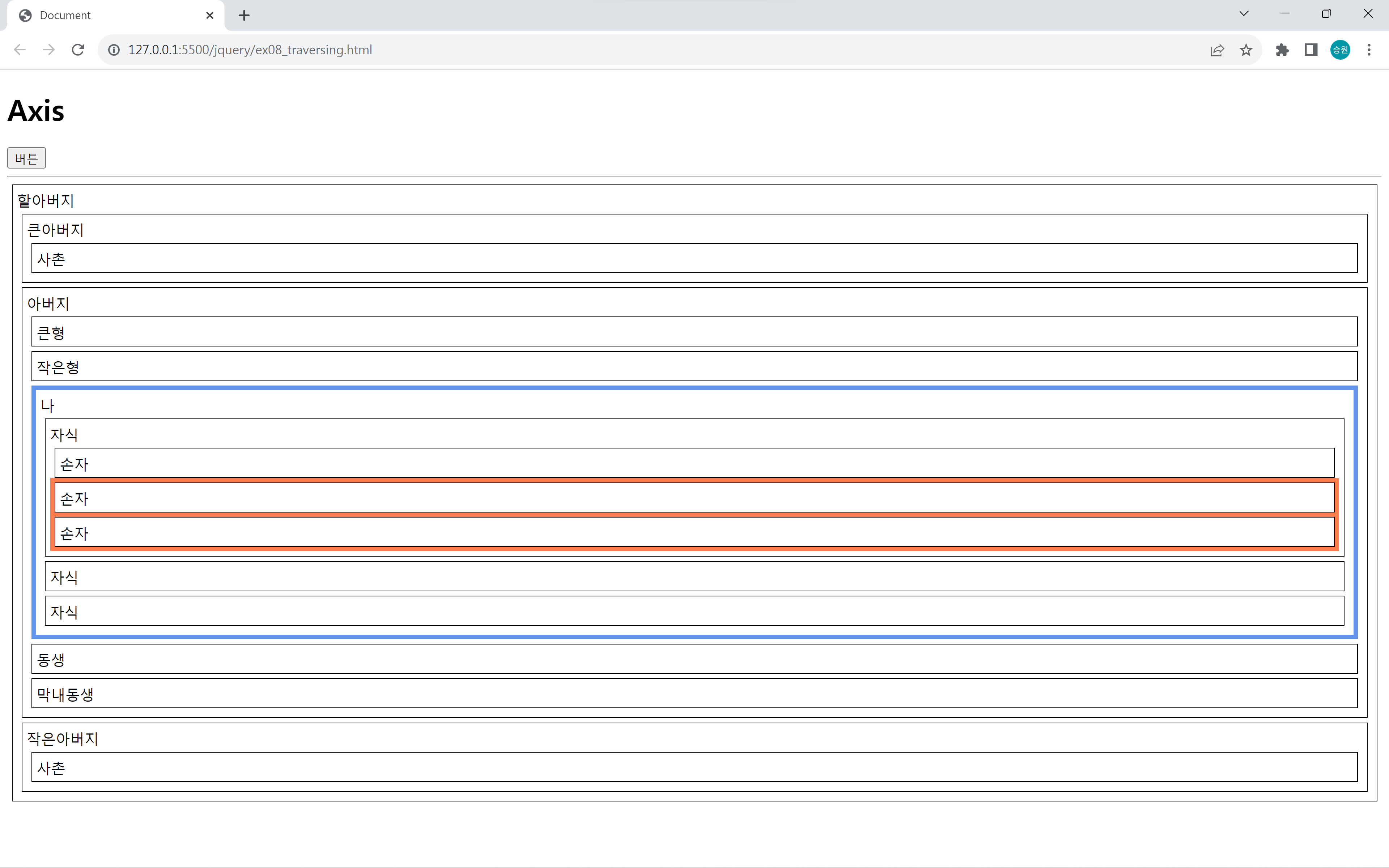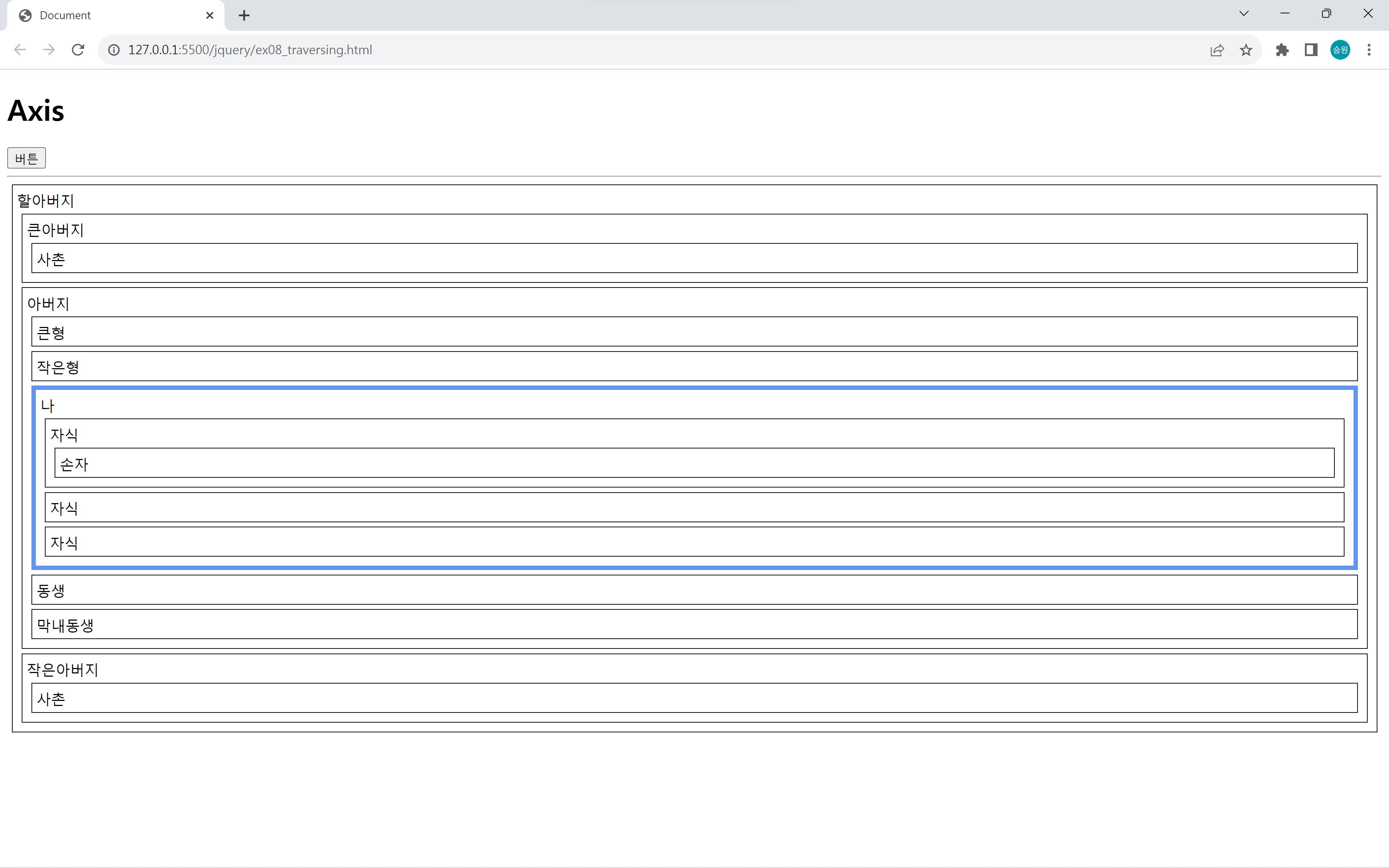 🍁Axis 태그를 찾는 방법으로 식별자를 이용해서 찾는 방법이 있고, 축을 기준으로 찾는 axis 기능이 있다. 기본 코드 Axis 할아버지 큰아버지 사촌 아버지 큰형 작은형 나 자식 손자 자식 자식 동