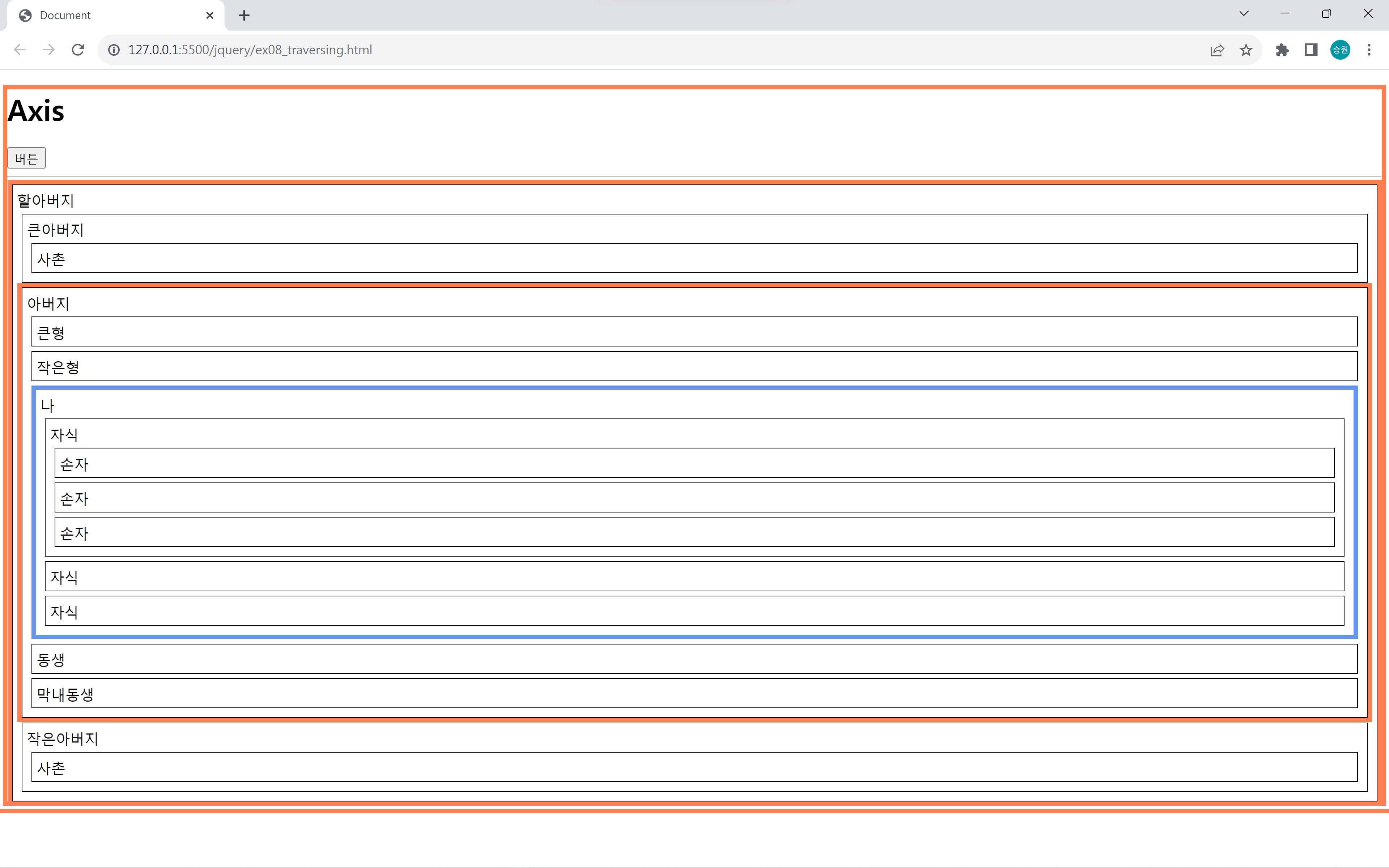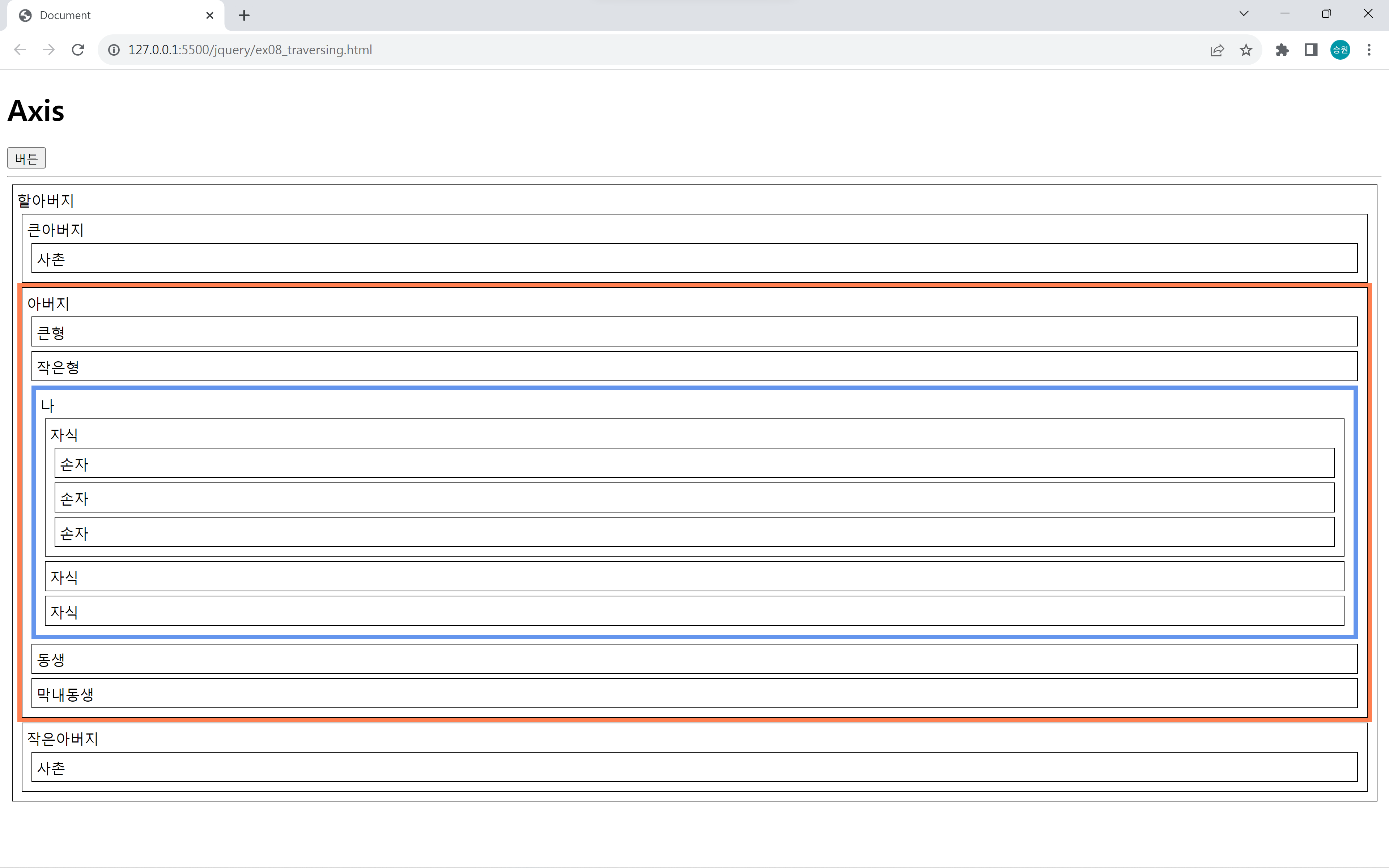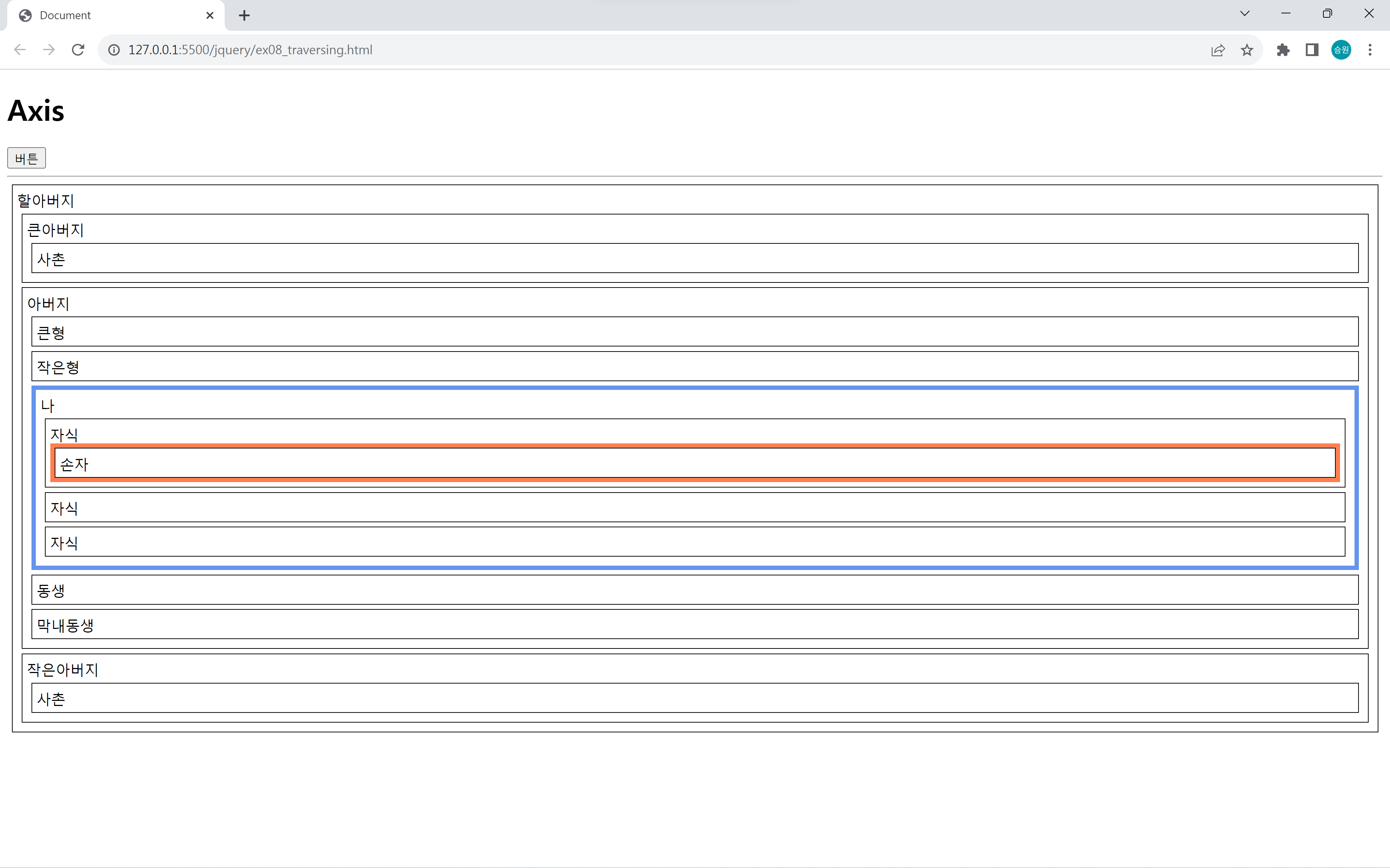 🍁Axis 태그를 찾는 방법으로 식별자를 이용해서 찾는 방법이 있고, 축을 기준으로 찾는 axis 기능이 있다. 기본 코드 Axis 할아버지 큰아버지 사촌 아버지 큰형 작은형 나 자식 손자 자식 자식 동